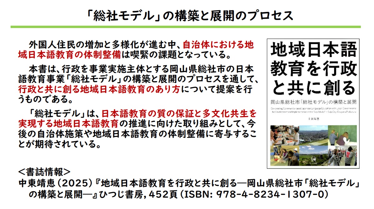 総社市には1990年の入管法改正以後、外国人就労者が急増したが、2008年の経済危機により大量解雇され危機的事態を迎えた。外国人を地域住民として受け入れていくため、2010年に行政を事業主体とする「総社市地域参加型生活サポート日本語教育事業」を立ち上げた。コーディネーターとして事業の運営・全体統括を行い、〈地域〉をキーワードに6つの取組を展開し、外国人の日本語教育を、地域住民同士の交流を通して地域全体でサポートするシステム構築とネットワーク作りを行っている。