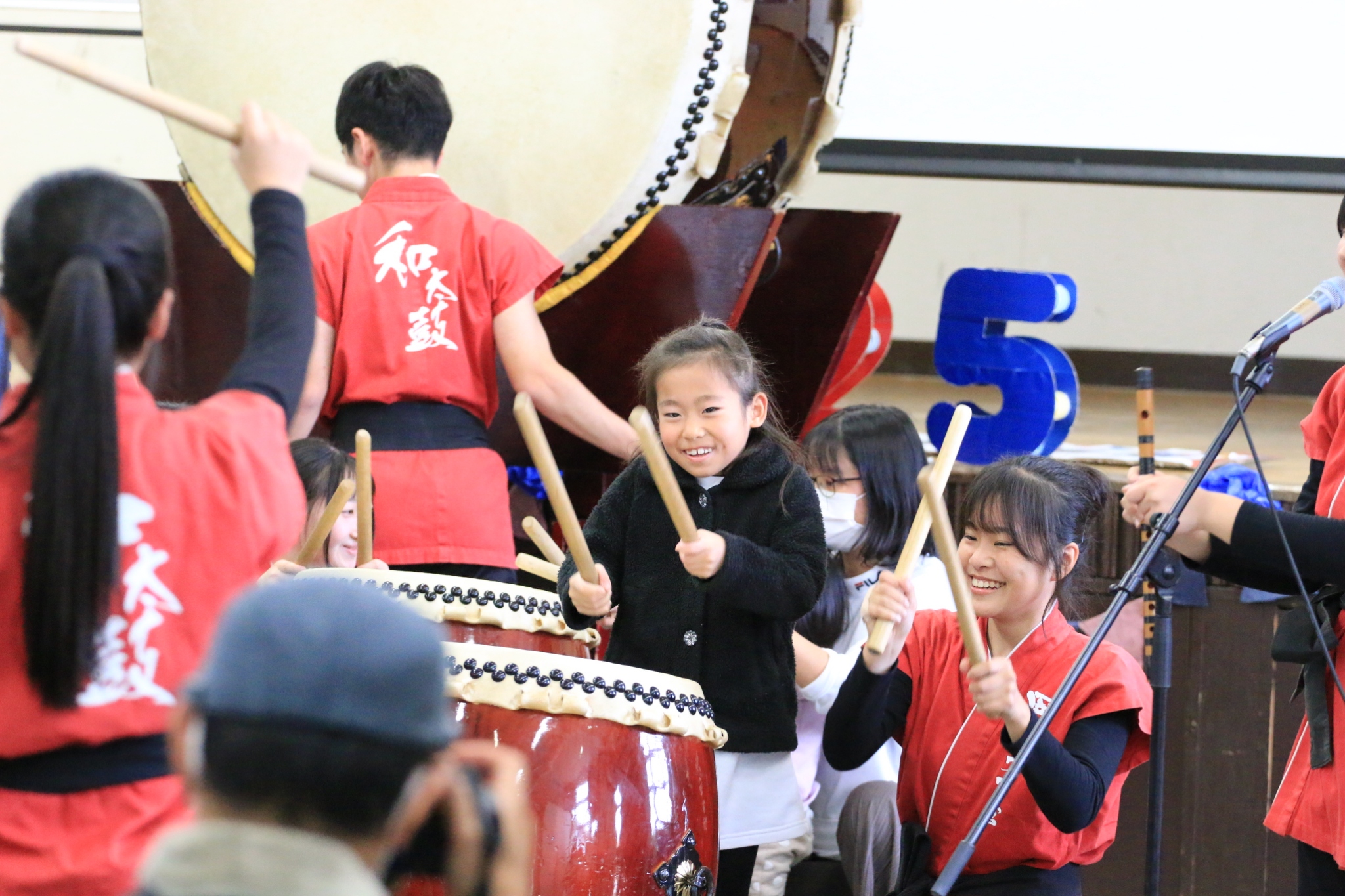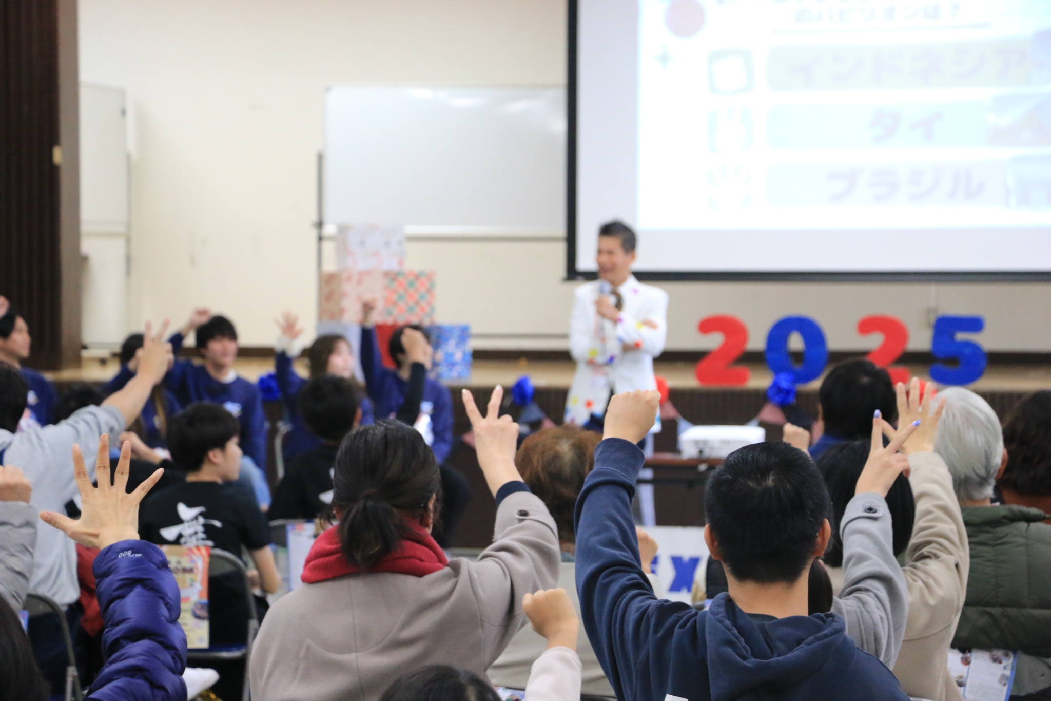 当日は、1階と2階の2つのステージ、さらには屋外広場までを使用した多様なプログラムを展開しました。目玉企画として、昨年度に続き万博マニアの二神敦氏が登場し、「万博クイズ大会」を実施。万博について楽しく学ぶ機会となりました。ステージでは、津島小学校吹奏楽部によるオープニングを皮切りに、朝日塾小学校のうらじゃ演舞、山陽学園中学校・高等学校のハンドベル演奏、岡山学芸館高等学校和太鼓部による演奏と体験ワークショップなど、計15団体以上がエネルギー溢れるパフォーマンスを披露しました。