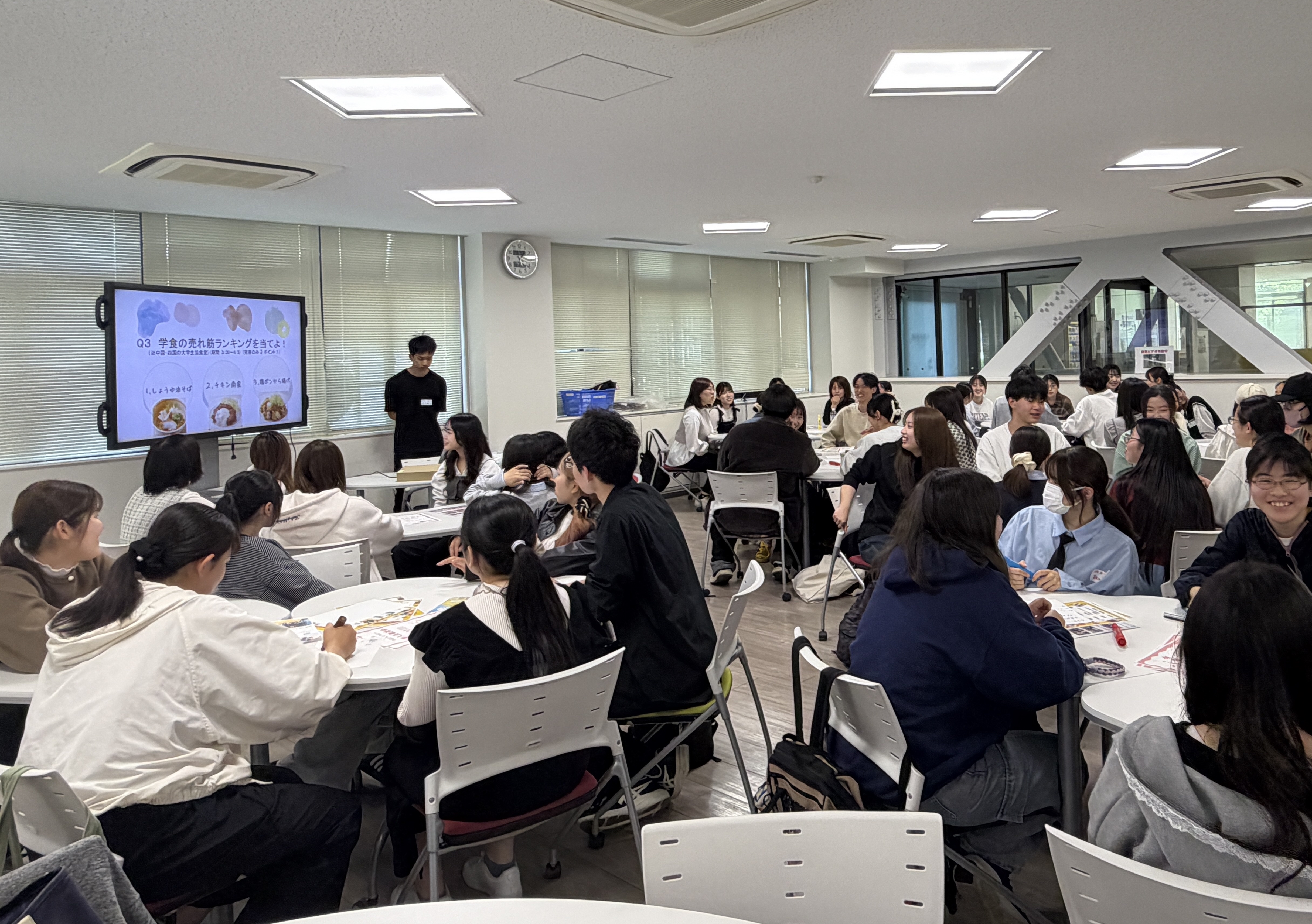 説明会には、アンバサダーとして活動している「SDGsアンバサダー運営部」「岡山大学TABLE FOR TWO」「Frontier School」「Copain」「Global Project」「Nature」の計6団体が参加しました。アイスブレイクに続き、SDGsアンバサダーの概要説明、各団体の活動紹介を行いました。PV視聴や団体クイズを通じて参加者同士の交流を深めながら、具体的な活動内容を知ってもらうことができました。また、説明会終了後は各団体との交流時間を設け、興味を持った団体についてさらに深く理解する機会となりました。当日は新入生に加え、2年生以上の在校生も多数参加し、楽しみながらSDGsアンバサダー活動への理解を深めるイベントとなりました。